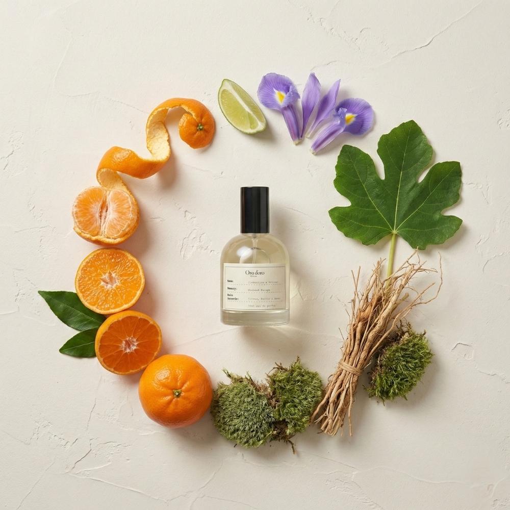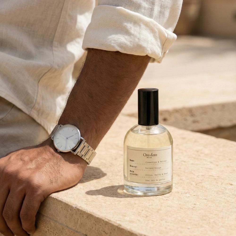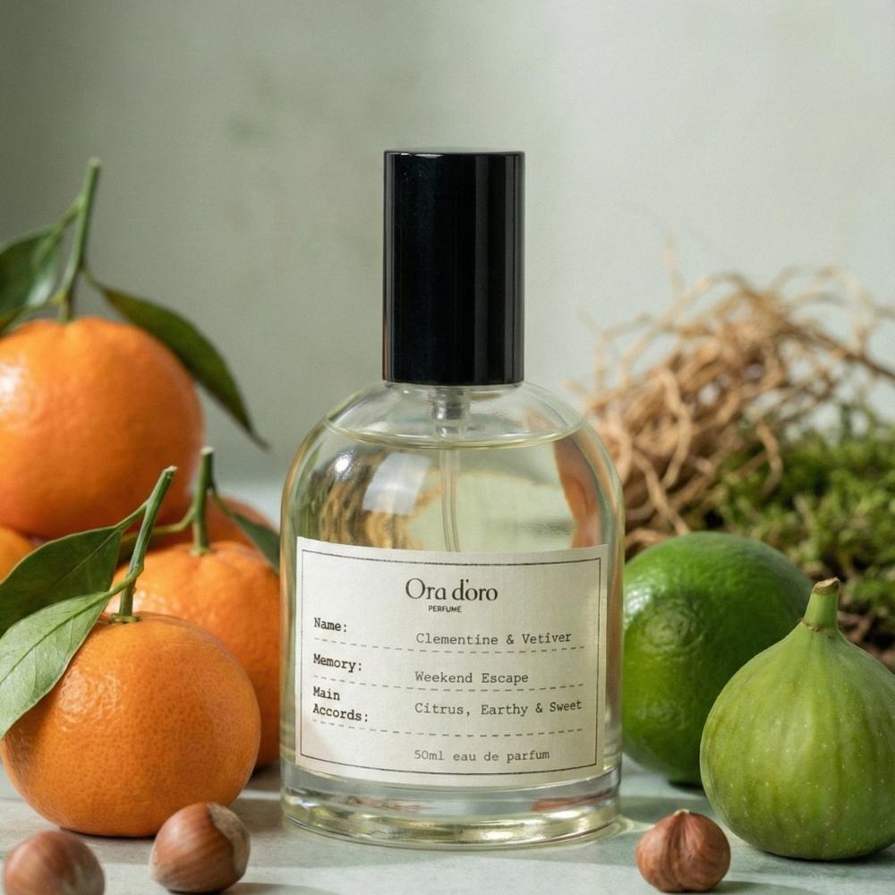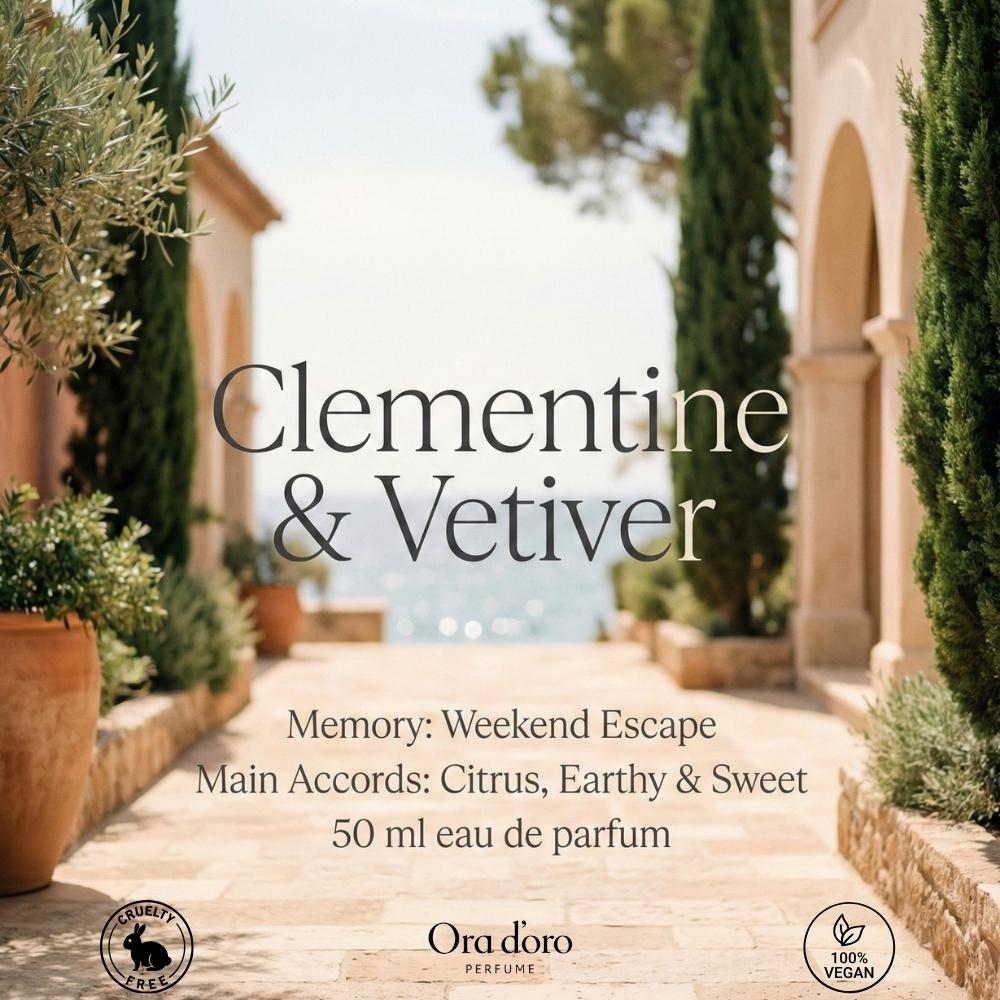 Clementine & Vetiver opens with a radiant burst of clementine, mandarin orange, and a squeeze of lime that feels instantly uplifting, like sunlight hitting warm skin. As it settles, the heart becomes softer and more intimate, where powdery iris blends with the creamy sweetness of fig and the gentle nuttiness of hazelnut, adding a comforting depth that is both elegant and slightly indulgent. The base lingers with earthy vetiver wrapped in green moss and smooth vegan suede, creating a warm, grounded finish that balances the bright citrus with a sweet, velvety trail. The overall accord is a beautiful harmony of citrus freshness, subtle sweetness, and earthy sophistication that feels clean yet deeply personal.