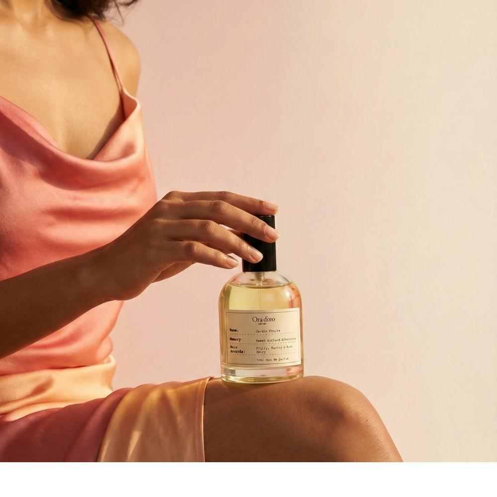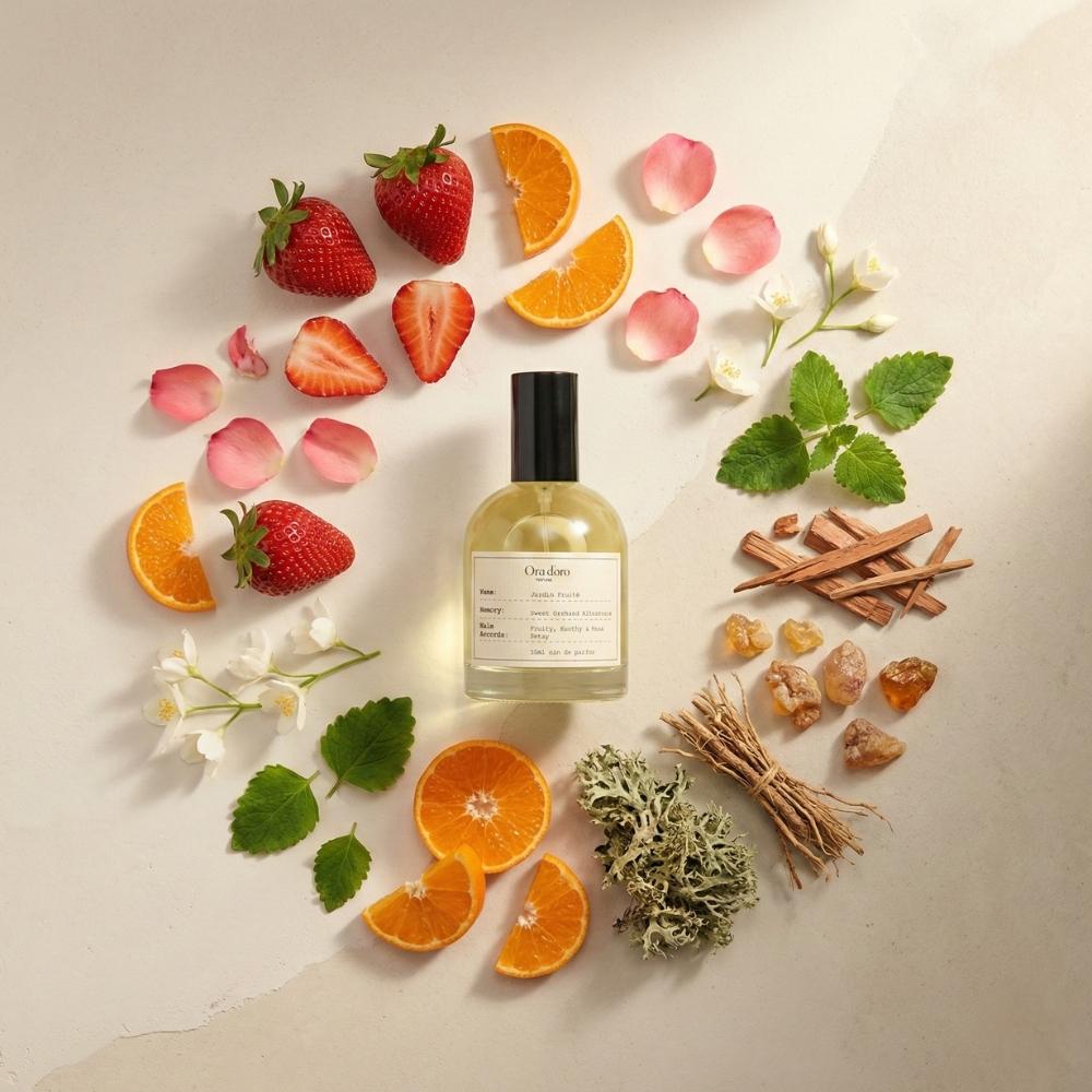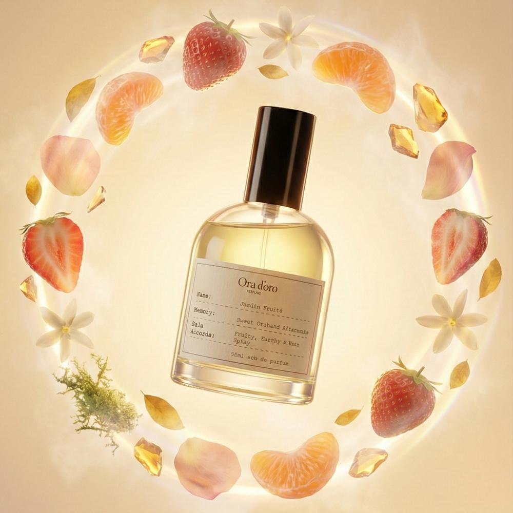 Jardin Fruité opens with the juicy brightness of ripe strawberry kissed by sparkling mandarin orange, instantly playful and inviting. The heart blooms into a graceful bouquet of rose and jasmine, adding a soft floral elegance that feels romantic yet natural, never overpowering. As it settles, the base reveals a rich blend of patchouli and sandalwood layered with glowing amber, oak moss, and vetiver, bringing an earthy warmth and gentle spice that grounds the sweetness beautifully. The overall accord is a lush fusion of fruity vibrance, floral charm, and deep woody warmth - indulgent yet balanced, sweet yet sophisticated.